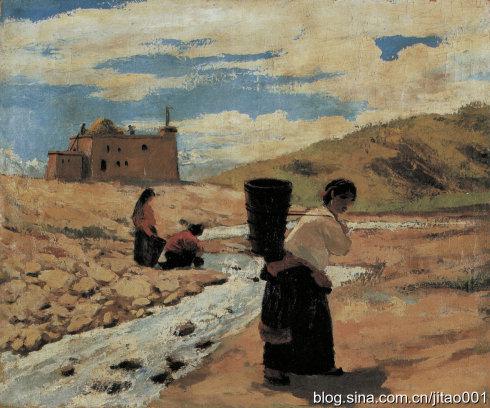吴作人一向不以为逼真就是艺术。他的油画技法,有着抒情写意的特点。在某种程度上是受了他的比利时老师白思天晚年画风的影响,但主要还是受到了中国水墨画技巧的影响。四十年代激荡人心的西北之行后,他发现高度写实油画本身的性能不能满足他的艺术创作理想。西北之行使他获得了新颖题材,他在油画上吸收了水墨画的表现特性,这使他的油画艺术面貌产生了一次飞跃,使他的艺术创作观念更向中国审美体系回归,更加注意艺术的表现而加强写意性。