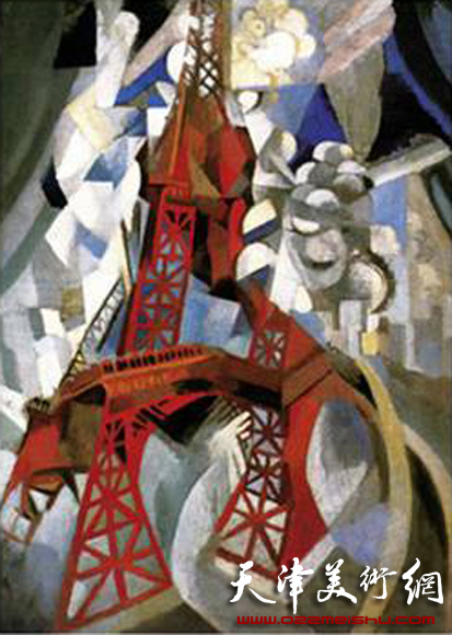 [邓捷]:这是一幅立体主义画家德劳内的《红埃菲尔铁塔》,后来他把自己的画弱化铁塔具象的因素,而后又继续强调色素的几何形体,塔铁塔完全的被去掉了。不同的颜色在人的内心可能产生不同的思想感觉,一个红颜色出现,马上闭眼睛可能会在眼前出现一个相关的补色。画家力图通过这样的颜色去深挖人的感官系统对于不同颜色所产生的不同的心理效果,这种心理效果被画家进行大量的挖掘,最后的表现就是荷兰几何非具象画家蒙德里安的《构成A》,把不同的补色凑在一起,他追求的是一种舒适的感觉,形成一种窗玻璃的结构。