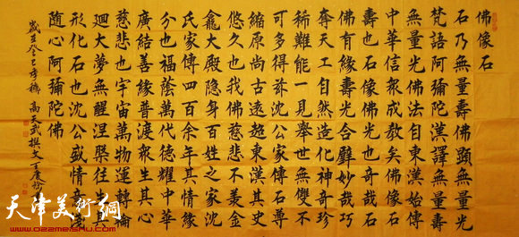 高天武认为能力有限几次推辞婉言谢绝。但沈大爷执意要求高天武为“佛像石”留下字迹以作纪念。盛情难却,高天武净手随心撰文《佛像石》,并请天津市书法家协会会员王庆余用正楷抄写。是日,年逾古稀的沈大爷从塘沽来到古镇杨柳青,将家传四百余年的珍宝“佛像石”也请到杨柳青。西青美协常务理事吕爱茹等进行了热情的接待。高天武、王庆余怀抱“佛像石”合影,并将合作的《佛像石》书作赠与沈大爷。 (舒文)