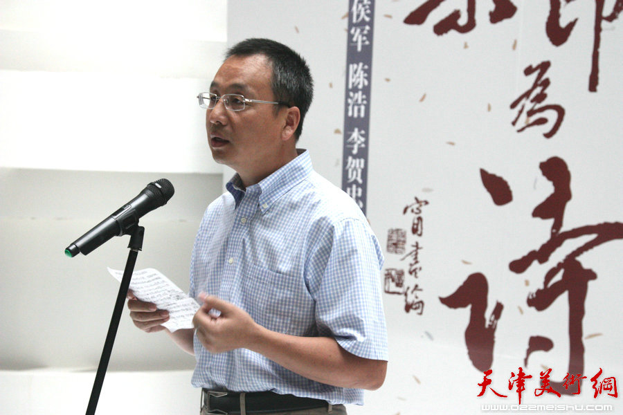“集印为诗——侯军、陈浩、李贺忠书法篆刻展”在智慧山艺术中心开展,图为天津市书法家协会主席唐云来致辞。
