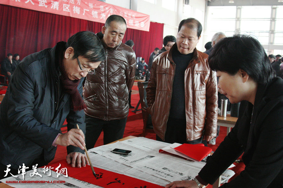 天津美术网讯 为响应天津市委宣传部提出的“深入生活、扎根人民”的号召,结合中国书协开展的“我们的中国梦——万名书法家送万‘福’进万家”的公益活动。今天(1月7日),天津市书法家协会组织本市21位著名书法家深入武清区梅厂镇为村民送福迎春。吸引了当地村民到场排长队“抢福”、“抢春联”。
