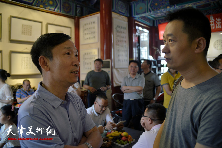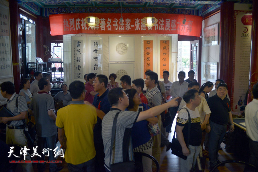 天津美术网讯 “中国梦·跨越2015”名人书画系列展第七期—张建会书法展7月4日在天津古文化街戏楼“集真阁”举办。本此展览未设开幕式环节,取而代之的是一场简约的书法座谈会,陆续莅临现场进行交流的嘉宾有:中国美术家协会副主席何家英、天津美协主席王书平、天津市书法家协会副主席喻建十、李锋,以及赵士英、任云程、窦宝铁、肖培金、陈传武、孙建中、柴博森、郝金宝、郝军、杨健君、邢纪庆、周午生等。