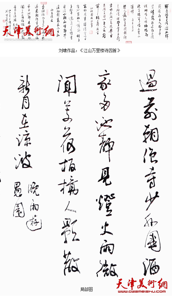[刘啸]:随着时代的进步,书法逐渐走进殿堂、展厅和百姓家,成为大众欣赏的艺术品。近年来不断有朋友向我提出:有些书法作品我们看不懂、欣赏不了。的确,书法作品有上、下之别,优、劣之分。如何欣赏,我简单的谈一下自己的认识。一是阅读内容,了解作者。书法是用汉字表达深度文化含义的优美书写。书法作品的内容,欣赏着首先要阅读明白,写的是什么诗词文章,然后看落款,知道是哪位书家写的。进而了解这位书家在书法上有哪些建树,擅长哪些。因为每个成功的书法家都是一个成功的自我,不同时代的人,不同的家庭出身,不同的文化素养,不同的社会经历所创作的书法作品,风格迥然不同。二是分辨书体,了解传承。中国书法从生成到成熟上下五千年,从秦代统一文字,经汉、唐、宋、元、明、清历代的继承发展,形成了真、草、隶、篆、行五种书体延续至今。且不同的书体还有着多样的书风。楷书有欧颜柳赵,行书有苏轼、米芾、黄庭坚、王铎等,要从作品中看出作者的历史传承,他的字出自哪里,学过谁,都要仔细分析。三是解析技法,品评神采。书法艺术区别其它艺术门类的突出特点,就是作者在法度之内,准确把握技法加以充分的展现。所谓的"法"就是指笔法、结体、章法、墨法。笔法,也就是用笔的方法,它有中锋、侧锋、偏锋、露锋、藏锋等方法,行笔过程中有快慢、有缓急、有停顿,不同的动作会出现不同的艺术效果;结体,就像盖房子需要设计,高的、矮的、圆的、方的,以及内部间架结构要巧妙安排;章法,就像美术构图,疏的、密的、虚的、实的,要有科学的分间布白;墨法,墨分五色:干、湿、浓、淡、枯,交影生辉。如一个书法家能娴熟使用这些方法,创作的书法作品一定会有丰富的艺术内涵。在分析了技法的基础上,就是要看作品中注入了作者的精气神有多少。古人讲的神采为上就是这个道理。王羲之《兰亭序》给人和谐、宁静、文雅;欧阳询《九成宫》给人以端庄、严谨、森严;张旭、怀素的草书给人以狂放、流畅之感。这种感受都来自书写者的情怀和生命律动。总之,一篇作品的文化深度决定着艺术高度,没有好的文化深度,再好的技法,展现给人的只能是空洞的形式。如果具备深度的文化内涵,但没有好的技法,那就不叫书法,充其量是抄了一篇好的文词而已。