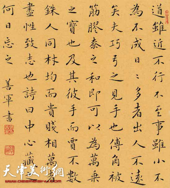 张善军,天津人。1971年生,自号慕纶,斋号玉轩。中国书法家协会展览中心书法创作员,八岁开始习书,志学之年由信手临习趋于自觉。先后得津门书坛名宿宁书纶、赵伯光等诸前辈耳提面命,书艺得以长足之进。及长,因温饱故而奔波,遍历坎坷,终以坚忍之秉赋得见曙光。衣食既足,遂醉心收藏。最难得者三十余年间无论境遇如何而未消赤子本色,每每案头窗课时至达旦,书卷气息得以沛然生焉,会心者视其书亦可类其人也。