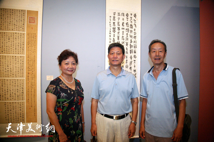 天津市书法家协会副主席顾志新、静海区委宣传部常务副部长邢才芝、书法家于浩泳在展览现场。