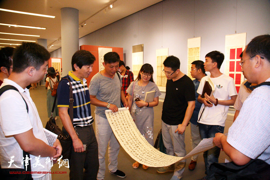 天津市河东区书法家协会主席李向群、书法家王一凡等在展览现场。