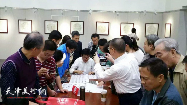10月6日,韩嘉祥先生在书法展上与观众互动交流,点评临吴玉如楷书。