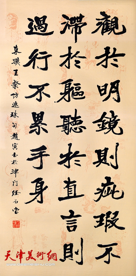 [赵寅]:是这样,10月16日在天津美术馆举办一个“学习用典·百字赋”书法展,这个展览由天津市和平区统战部主办,中国致公党天津市和平区委员会承办。展览的内容分为两部分,第一部分就是以习近平总书记讲话论点为依托,这个有一百件作品,另外在去年年前我自己出了一个创意,这个创意就是我用中国最有震撼力,最有影响力的一百个汉字用榜书的形式书写出来,这个书写过长当中我吸取了秦、汉、魏、北齐、晋、唐以及明清时期大家的风骨去书写的,然后又用儒、释、道、说文解字还有一些传统文化的深邃来解读了这个汉字,后来经过我一个好朋友张志钰的共同商讨,又把这一百多个字组成了一个“赋”,古有千字文,今有百字赋,这个百字赋就是用这100个字穿成了4个字一句,4个字一句的形式,来歌颂咱们的和谐社会,歌颂咱们来之不易的美好生活,整体的作品一共筹划了212件,在天津美术馆2号展厅和3号展厅同时展出,到时候也希望大家去观临指导。