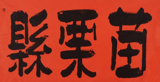 周长民先生书法直取汉魏,率性情真,大巧若拙,恣意天成;以画家情怀,融现代观念构成,不媚俗世,傲骨书坛。尤善榜书大字,称书小字不足以抒情。