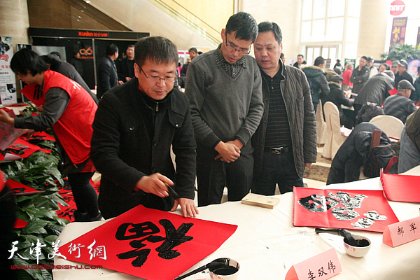 天津美术网讯 今天(1月15日)上午,天津市书法家协会、天津市美术家协会组织本市30余位书画名家在今晚报大厦为广大市民“迎春送福”。通过写“福”字、春联,创作精美国画作品的形式,提前为全市人民拜年。