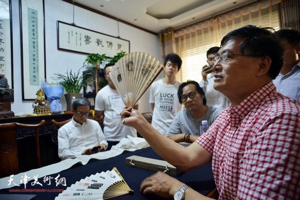唐存才向津门书画家、爱好者介绍艺术品。