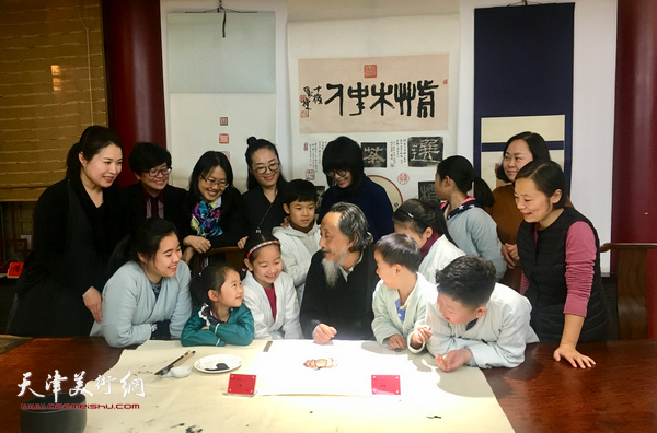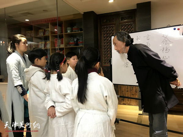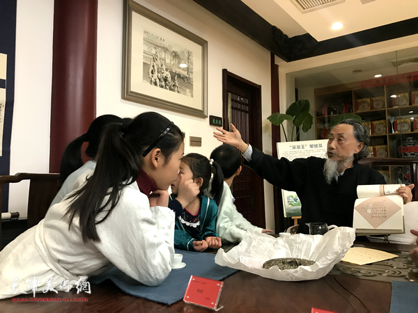 十权老做客“老茶坊”国学讲堂,为小茶人传授茶档心画知识。