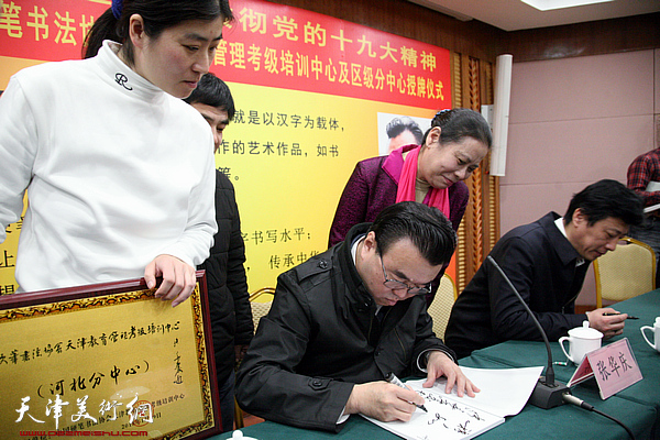 张华庆向中国硬笔书法协会天津教育管理考级培训中心区级分中心授牌。