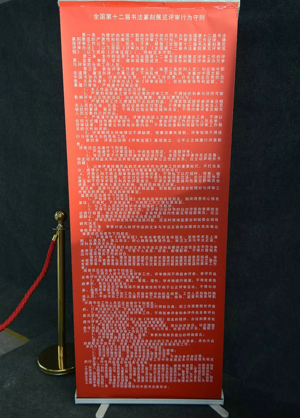为确保评审的公平、公正、阳光、干净,十二届国展在总结十一届国展评审经验的基础上,制订了缜密的评审规则、流程和更严格的评审纪律。制定了《全国第十二届书法篆刻展览评审办法》《全国第十二届书法篆刻展览评审流程》《全国第十二届书法篆刻展览评审行为守则》,严格规范评审程序和工作行为。全体人员签订自律《承诺书》。