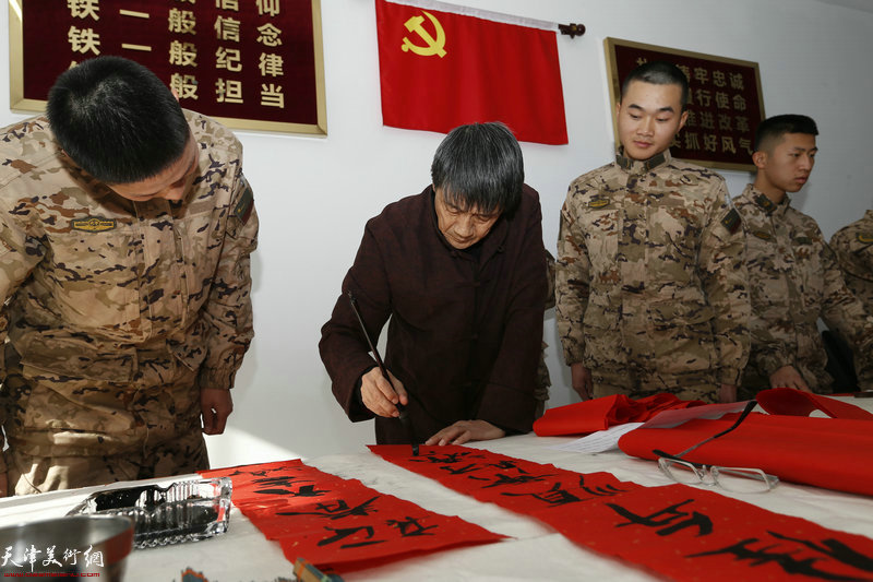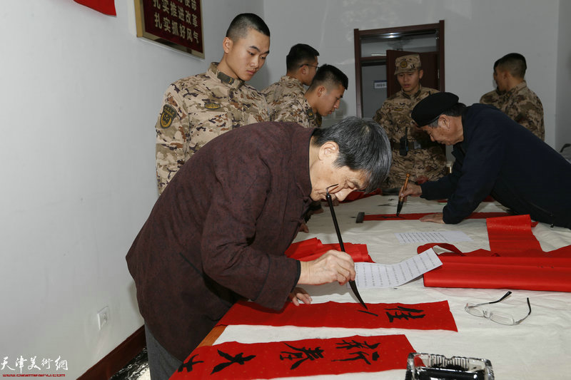 天津美术网讯 辞旧岁军营齐欢乐融融,迎新春官兵和谐情深深。为营造祥和、喜庆、融洽的春节氛围,天津市书法家张文蓀、袁强民、张茂起先生日前来到武警天津总队机动支队某大队写春联、写福字,还为官兵传授书法技艺,用书法艺术为全体官兵送上新春祝福。 (张春生 特约摄影报道)