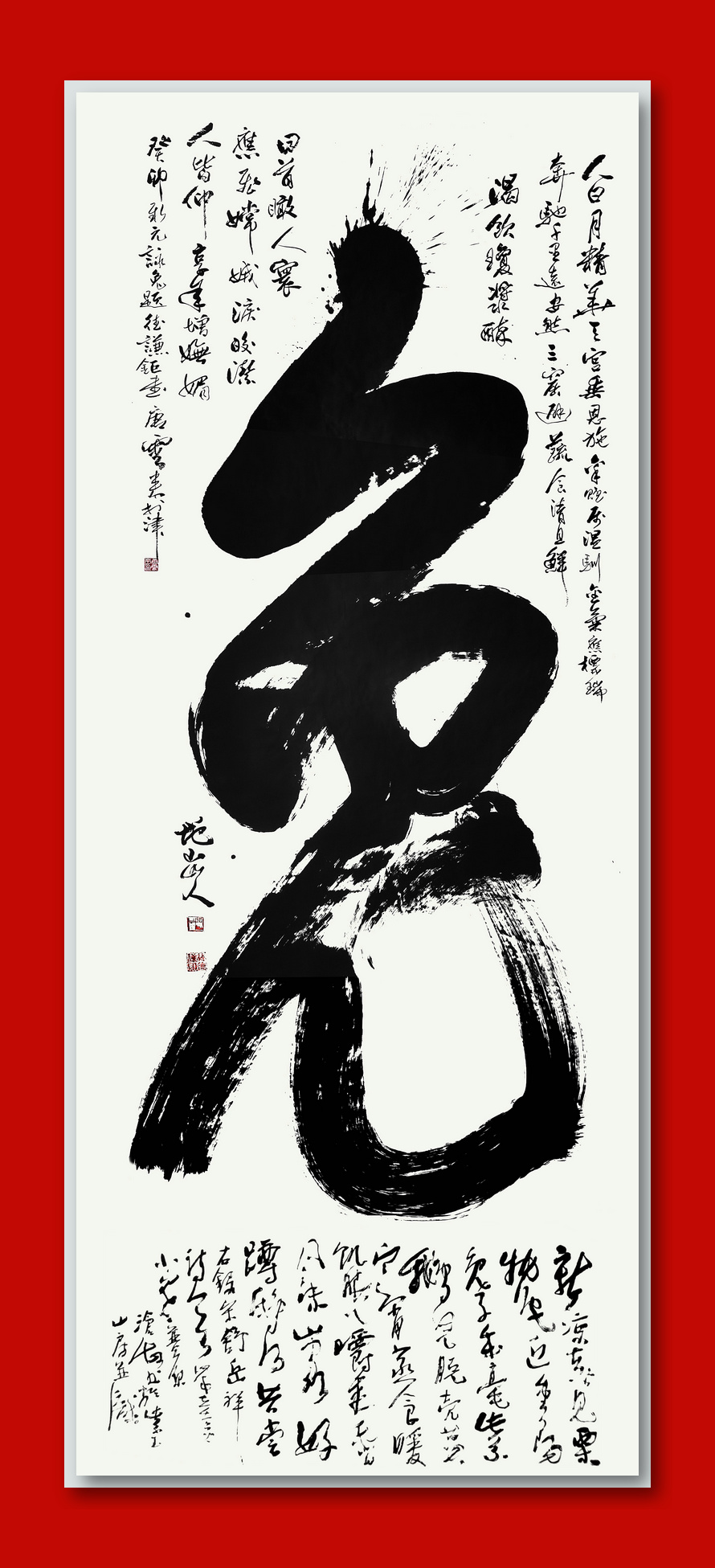 余师一挥而就,诗书双璧也。吾终鲁钝不捷,师之书意尚未参详,浅尝试论耳:余师之书更近于《易》,其毫间起伏,力弥气盈,勾划处笔笔皆自在亦每每不越矩,故而观之尝忘书内言而纯享其意也。此题中,线条虬然似《明夷》新《晋》之象而得浮沉俯仰,墨韵燥润似春《复》秋《剥》之象而得枯荣明晦,章法诡谲似分《夬》遇《姤》之象而得辗转腾挪,笔力雄浑似《大有》沛《颐》之象而得壮阔波澜,势险体峻似行《蹇》驻《困》之象而得扬抑决断,神毅情坚似聚《丰》合《咸》之象而得精约远奥,荣姿摇曳似弊《革》盛《鼎》之象而得脱凡入圣,充魂纳魄似昌《泰》怡《萃》之象而得臻境无极。噫,实《易》之变而道之附也,吾辈今亲得此胜章,何其幸也。余师谦逊,以年齿幼于德谦先生而录于帧下,以空首而待同仁再补也。后,辗转至唐公云来,公乃津门书法之魁首,从业艺文双修而为人亦朴实平易,吾辈之佳范也。公观此钜书,意味酣然,顿酿诗兴也,须臾腹稿已成,得五言古风一首,借《平水韵》去声之四寘,遂题于首,诗曰: