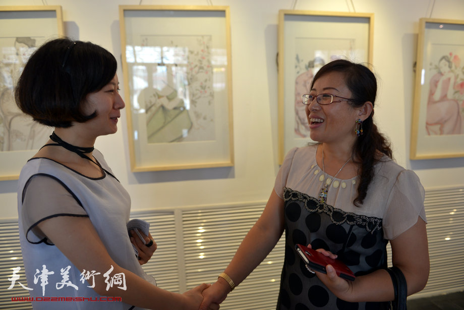 “旗袍,难舍的古典情怀 马兆琳经典水墨作品展”6月28日在北塘古镇开幕。图为马兆琳与天津北塘运营管理有限公司副总经理阎艳在画展上。
