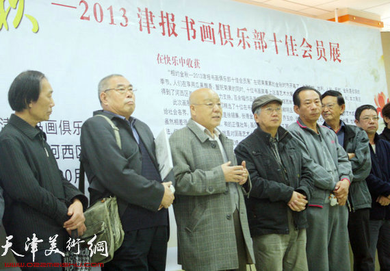 名家曹留夫(左四)、刘凤棋(左三)、河西区美协秘书长郑爱民(右三)分别讲话,祝贺画展成功举行