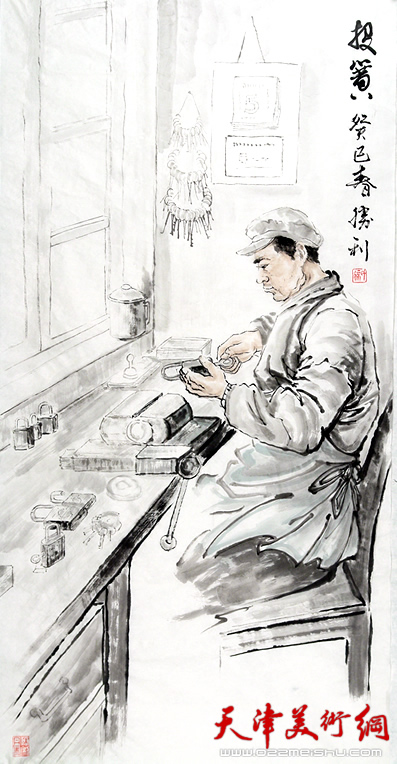 [徐胜利]:我画的人物画里面,有些都是些小人物,当时我有个感悟,我看到现代城市突飞猛进的发展,我感觉咱们现在就是生活在钢筋混凝土组成的一个森林里面,人与人之间的沟通少了,所以总是让我想回念以前的那些景象,那时候大家都生活在一个大杂院里面,有的区小卖部打零酒,有的老人在玩核桃,有配钥匙的师傅,还有剃头刮脸的师傅,这些生活场景经常在我脑子里像过电影一样反映出来,所以那时我就有个想法,想创作这系列的作品,就是过去有的,现在看不到的,后代人更看不到的东西,通过自己的创作表现出来,于是我根据我的思想创作了一些作品,比如说画剃头的作品,我起的题目是“上至达官,下至列兵”,取了这么一个名字,还有幅作品,有个老人家到小卖部去打零酒,我起的是“就好这口儿,爱喝酒”,配钥匙的老工人那幅作品,我起的是“投簧”,我还画了一对老两口,自己往院里运煤,后来老头眼睛迷了,老太太给老头吹眼睛,这幅作品叫“老伴”,也反映出两位老人的子女都进城务工了,只剩下这对老夫妻成为了留守人员,所以我总是想把这些东西反映出来,而反映这些东西通过什么去刻画呢?就得需要想当时的场景,让看画的人身临其境,所以要把观画的人引进当时场景,所以我从这方面考虑的比较多。例如:过去的酒馆是什么样的,过去的穿戴是什么样的,过去的服饰是什么样的,他们当时的内心表情是什么样的,通过这些创作,把当时那个场景充分体现出来,为了画这些题材的作品,我画了许多的素描稿,一遍又一遍,使劲地挖掘脑子里的旧印象,然后再通过画笔表现出来,我之所以有这么一个想法,因为以后再也看不到这样的东西了,过去挑挑子剃头的,现在哪还有?现在都是美容美发厅了,刮脸的都几乎没有了,所以通过这些东西把过去的片段表现出来,也是对于社会发展的一个资料存档吧,让后代看看我们过去是如何生活的。