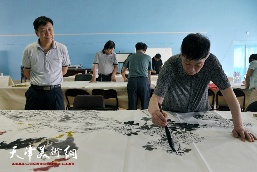 天津美术网讯 天津部分书画名家近日为天津国际文博会“巨制经典合作展”创作大型国画现场活动举行。