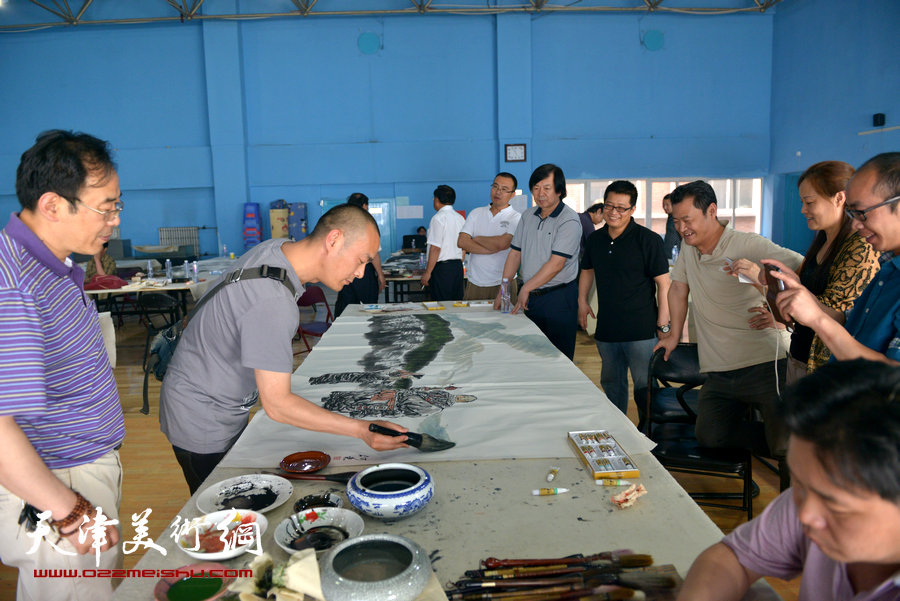 津门三代画家为“巨制经典合作展”创作大型国画现场活动。图为王书平与白鹏、王爱宗、徐展、阚传好、韦韬等在交流。