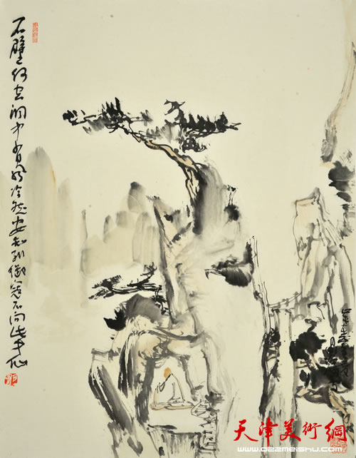 能够“游于艺”对于艺术家是一种最快乐的事,但是,尹沧海又不仅仅止于“游于艺”,而追求“游于心”。他探讨禅宗写意画对中国写意画的影响,禅宗写意画由于透悟禅理,皆为“意思简当,不费妆缀”,“皆随笔点墨而成”。傅抱石先生曾借用了佛教似的用语“墨即是色,色即是墨”对这类禅宗写意水墨画风作了哲理性的描述。人生的不自由即是指烦恼、生死,而人生的自由也尽在不自由之中,解脱之道即在由迷而悟之中。“悟”即是分判自由与不自由的唯一界限。禅宗用“悟”来表示人生从不自由到自由的根本转变,从而在人的基本能力或人生的根本意义方面与审美经验沟通交融。“悟”不仅在目的或意义方面是审美的,而且在具体体验形式上也是审美的。在这个意义上来讲,写意水墨在精神上来源于禅宗的“顿悟”说。这种艺术创作状态可以达到一种“坐忘”境界,也可以说是一种心无旁骛的状态。对于艺术家来说,“坐忘”的历程就是对美观照的历程,是写意画写生与创作过程得以成立的主要依据。画家的“游心之所在”,就是老庄所提倡的物我两忘,超脱功利等一切外物的审美人生,是画家独辟的一条灵境,独创的一种意象。尹沧海深谙此理,他的《达摩面壁图》、《形容出造化 想象成天地——荷花翠鸟》、《空山无人 水流花开》、《莫谓无心便是道》、《莫道山中岁月长》、《心闲便是神仙》等作品,从表象式的摹写转换为内心精神主题的表现,体现的正是以禅意入画的笔墨方式。
