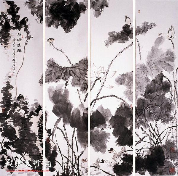 2009年意式风情街举办了一次画展,在这次画展上韩必省展出了一组水墨荷花四条屏,吸引了参观者的目光。这组既可联章又可独立的花卉,就是采用了大笔水墨写意的手法。整个画面疏朗平稳,笔意酣畅,水墨淋漓。
