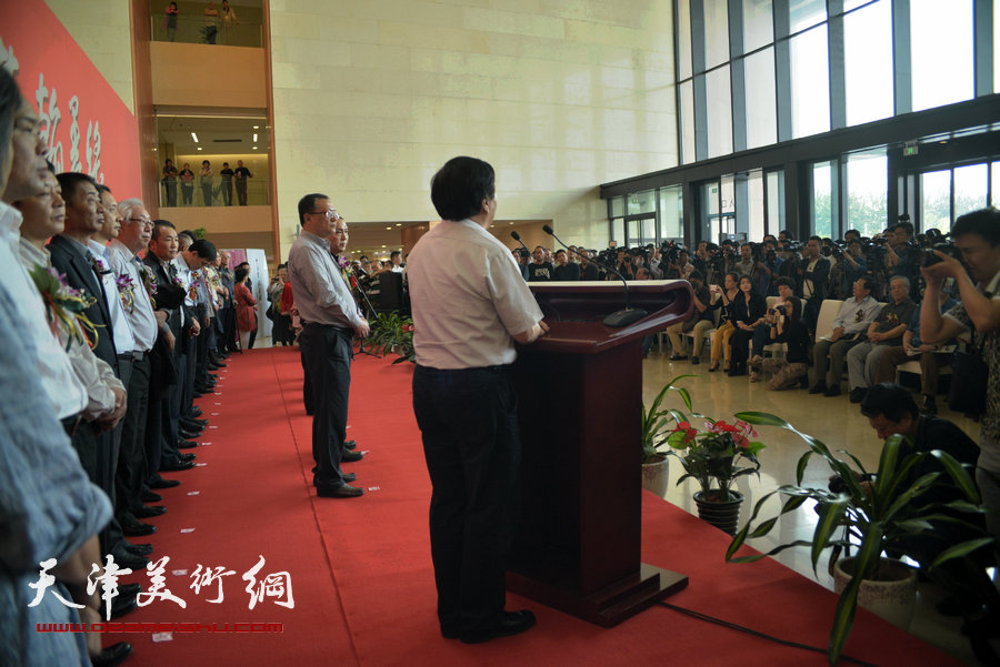 “中国梦·翰墨缘”五画院联展在天津博物馆展出,图为天津画院党组书记张桂元主持开幕式。