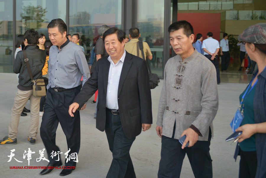 “中国梦·翰墨缘”五画院联展在天津博物馆展出,图为成其圣、杨晓阳、何家英。