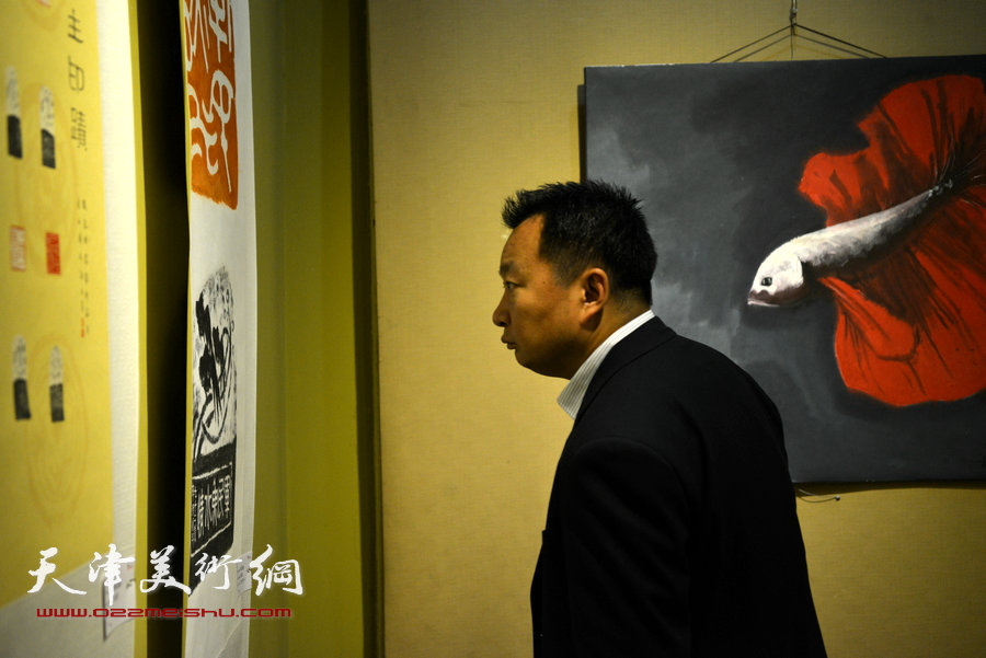 濠上观鱼——中华鱼文画书法绘画展在西洋美术馆开展,图为天津美协副主席刘国胜在现场。