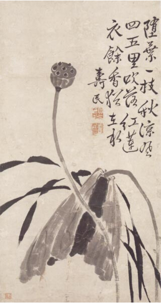 边寿民创作的这件水墨作品尺幅并不大。画作的右上边有大面积的留白,一首诗词题在上面,还有两枚钤印以及作者的落款。诗句与作品主题紧扣,将荷塘在季节更替中的变化表现了出来,十分自然有趣味。书法字体看起来十分娴熟公正,与水墨画很好的结合在一起,十分具有文人画的气息。