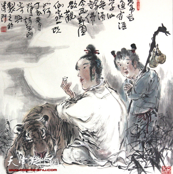 有的时候,朋友跟我说,再办一次展览吧,我说等70岁再说吧。我今年64岁,等70岁再办个好的展览。画画的同道们都挺抬举我,我的展览搬出来就得像个样。按照我目前的画法,难肯定是难,主要是难在虎纹上,虎头的几种形式是不变的,虎头如果偏一点,老虎身上的虎纹就得变了,虎头再偏一点,虎纹又得变了,我认为这个比较难,但是有了比较清楚的认识就好多了,通过这样不断地锻炼把笔墨技能提高起来。画画还有一个布景的问题,画得太工笔不行,画得太碎也不行,这是一个方面,还有就是画的时候要思考什么景与画面表达的思想相衬,还要思考什么景互相之间配合比较好看,互相之间怎么融合,融合好了,画面就耐看。