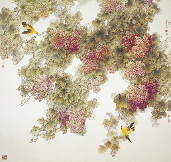 我们知道,历史上传统中国画的创作是掌握在有权有钱有文化的士大夫手里。传统文人是以“学而优则仕”为人生目的的,而绘画则是其寄托情怀的工具。“聊写胸中逸气”,“写心中不平之气”是一个正常文人必须要做的情感转移。一只毛笔,一篇文章,是他们最驾轻就熟的发泄途径。他们得意时讲孔孟,失意时讲老庄,所以,天地自然的一切事物便成了他们笔下的猎物。山水、花卉、走兽、蔬果都有了笔墨华章。还有一个重要因素,使这些题材得以文随代迁,就是书画用笔同法,而这类题材的造型和表现与中国书法的用笔能巧妙地吻合。像“石如飞白木如籀,写竹还应八法通”就是此意。这些自然事物因其自然,便可与创作者的自然融会贯通,于是,笔墨生成的线条便能很好地在“写意”和“似与不似”的美学观指导下,为物造型,为物传神。中国画不同于其它的画种,它有独立的文化审美内涵。古人讲作画要“应目会心”,要“澄怀观道”。王其华就是这样的一位画家。他多年来深研中国传统绘画,尤其对传统文人画的形式和内涵有着深入的领会。在当下注重生活素养的现实中,把生活的体验和传统的活性注入到创作中,使他的作品别有一种灵动。在创作上,他紧紧锁住线这个中国画的要凭。他把笔墨形式和传统融入了他现在的绘画,并形成了他的作品的内在的神。对古今画家画作的借鉴和继承,他似乎更重视文人画的率性写真和抒情达意,特别是在葡萄题材的创作上,尤其能表达这种观念,兼顾线的造型功能和抒情达意功能,兼顾传统的形式特征和生活素材内在的活性,这使他的作品呈现出一派生机,显露出他在艺术语言上的探索精神。