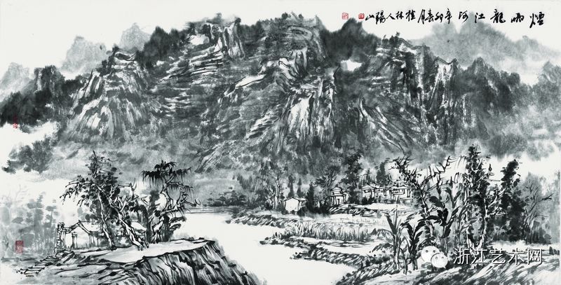 阳山,《烟雨龙江河》,纸本·水墨,68cm×138cm,2011年
