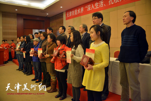 天津美术网讯 继12月15日第十二届全国美术作品展金、银、铜、优秀奖以及组织奖、先进个人奖等奖项的颁发,由文化部、中国文联、中国美协共同主办,集中展示五年来中国美术创作丰硕成果的“第十二届全国美术作品展览暨中国美术奖·创作奖获奖提名作品展”在中国美术馆开幕之后,昨天(12月29日),天津市美术界 “深入生活·扎根人民”创作工作推动会在津召开。天津文联主席陈洪、天津文联秘书长商移山、天津美协名誉主席曹德兆、天津文联副主席、天津美协主席王书平、天津美院院长、市美协副主席邓国源、天津画院党委书记张桂元、画院院长市美协副主席贾广健,市工艺美院院长、市美协副主席孙敬忠,天津美院副院长郭振山、天津美协副主席韩昌力、天大环艺系主任董雅及等各美术单位以及天津美协各艺委会负责人,新一届天津美协主席团成员及天津美展获奖作者和各高校师生代表及部分美术家代表四百余人出席了会议。