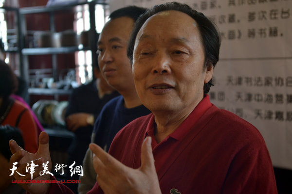 图为向中林在画展现场接受媒体采访