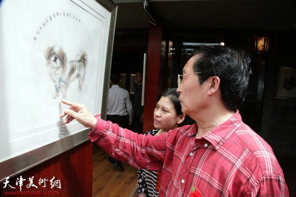 臻境微观-津门书画家小品精品展在杨柳青开展,图为韩文来与张荔萍在观摩作品。