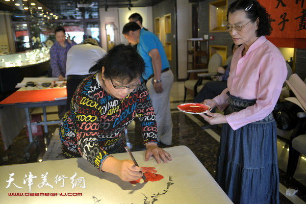 天津女子画院书画家募捐笔会现场,图为梦玉。