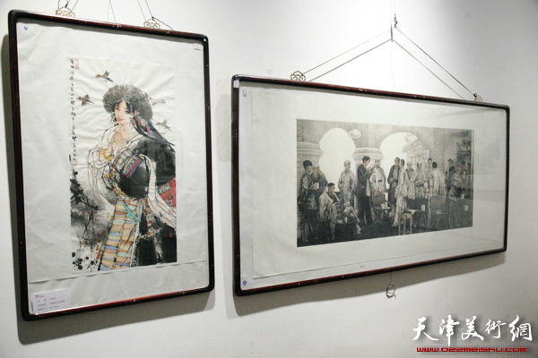 “走进宋庄——北京宋庄职业画家原创作品展”在天津西洋美术馆举行,图为齐秋景、李营在展览现场。