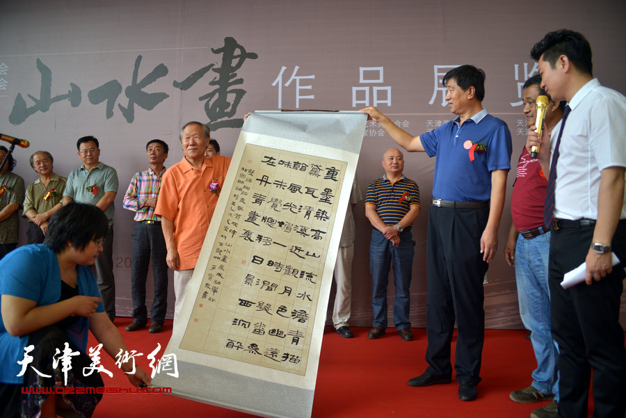首届天津市美术家协会山水画专业委员会山水画展览在天津美术馆开幕,图为河北省东光县县委副书记高鑫代表东光县向山水画专委会赠送书法家李宝众的书法作品。