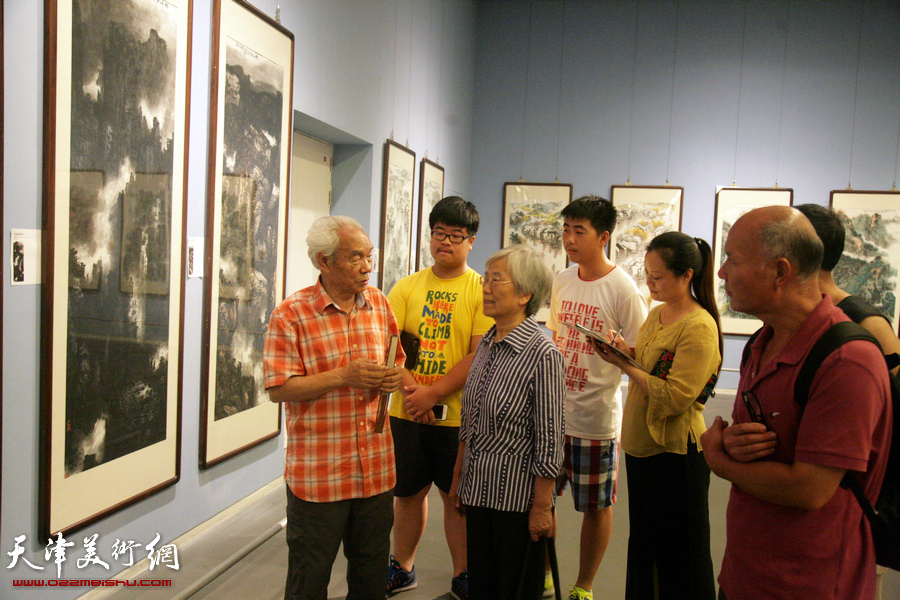 天津美术网讯 今天(7月24日),天津市美术家协会山水画专业委员会在主任姬俊尧的组织带领下,与山水画专委会名誉主任纪振民、副主任孙长康、向中林等一行来到天津美术馆首届天津市美术家协会山水画专业委员会山水画展览现场,为前来观展的书画爱好者讲解山水画,并点评画作。天津人民美术出版社副总编辑邢立宏,画家刘凤棋、董振涛、李旭飞、李学亮、卞昭宏、张芝琴、李铁泉、董云华,资深媒体人杜仲华等出席了此次活动。