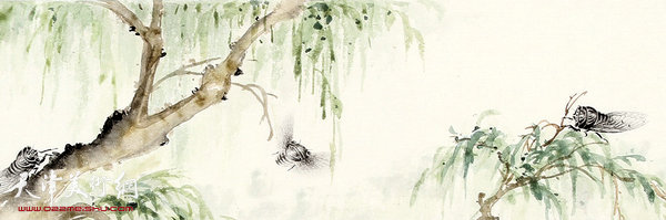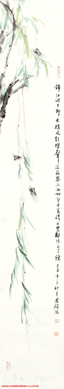 且看那两帧竖挑,窄中见大,夺人眼目。一边柳斜垂,三蝉撕翅,暖日依长,和风唱远。一柔丝掛中,蝉爬细柳,云情引逗,剪影低吟。加之款语留红,美不胜收!