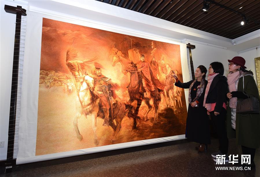 12月20日,苏绣大师姚建萍(左)向观众介绍她的巨幅绣品《丝绸之路·西出长安》,该绣品表现汉武帝送张骞出长安的场景。