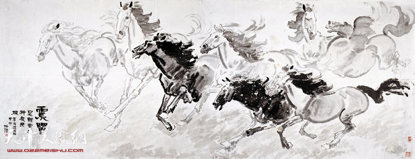 徐悲鸿画马也讲提练概括(如以金石味的用笔适当强调胸、蹄、鬃、尾、腹、使马体变“瘦”)但基本仍是写实的。造型准确优美。是十足的“真马”的传神写照。孙伯涛早年习油画,有扎实的写实功力,且曾师法徐悲鸿(他以徐氏法度所作骏马,可以乱真,曾为胡厥文、胡叔常,伯仲作双骏图,胡氏大加叹服,谓悲鸿后继有人)。但由于受汉画像石的启发和深刻影响,也学习一些西方现代艺术精神,所以他的“汉马”偏重写意,倾向于抽象、变形一路,但又不致扭曲到使人认不出是马的极端程度。由于推崇写实,徐悲鸿在勾勒马形体时基本上是笔笔落实,笔到墨到,无太多虚笔。孙伯涛则尽量简化,抓住最重要的头、胸、腿、鬃,寥寥数笔,常常不画马蹄。这种写意笔法不独使笔墨更有强烈的金石味,而且尤能表现骏马疾驰如飞,一闪而过的运动神姿。读他的“汉马”往往有棕种感觉:一匹扬鬃奋蹄的飞马,由于宇宙的突然变迁,被凝结成了化石。他的马因而给人以极深厚的历史沧桑感。徐悲鸿的马,在奔驰中总给人宁和安祥之感,虽然画家志在表现奋起抗战的时代精神,但仍透露出浓厚的书卷气。孙伯涛的马当然也有时代精神和气息,但都是狂烈不羁、电暴、雷怒,大有一冲直出纸外的劲猛气势。这是一种极度压抑后的发泄,是怒极无言的“张狂”横扫一切的笔势,让人想起古人论画的名言:“气冲交漠,与神为德。”