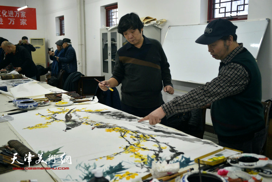 天津美术家深入蓟县山区程家庄村送文化,画家们集体创作《锦绣春光》。