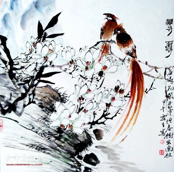 画家的花鸟画在继承王雪涛小写意花鸟画的基础上,融进了岭南、海派的没骨法,撞水、撞粉法等各种表现技巧,达到色、光、态、韵,各臻其妙。巨幅作品,信手写来,达到了以心写境、物我两忘、天人合一的境界。