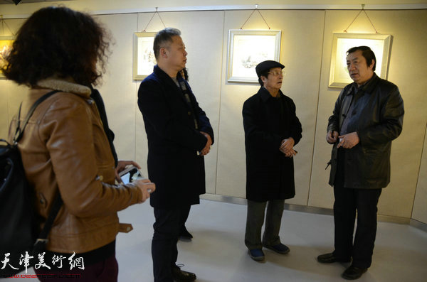 图为天津市群艺馆馆长李戈、市美协副主席史振岭、滨海画院院长孙玉河在画展现场。