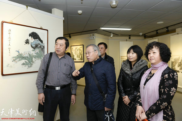 图为右起:天津市美协副主席史振岭、滨海画院院长孙玉河、市美协秘书长李耀春、市美协美展部主任张福有一起观赏作品。