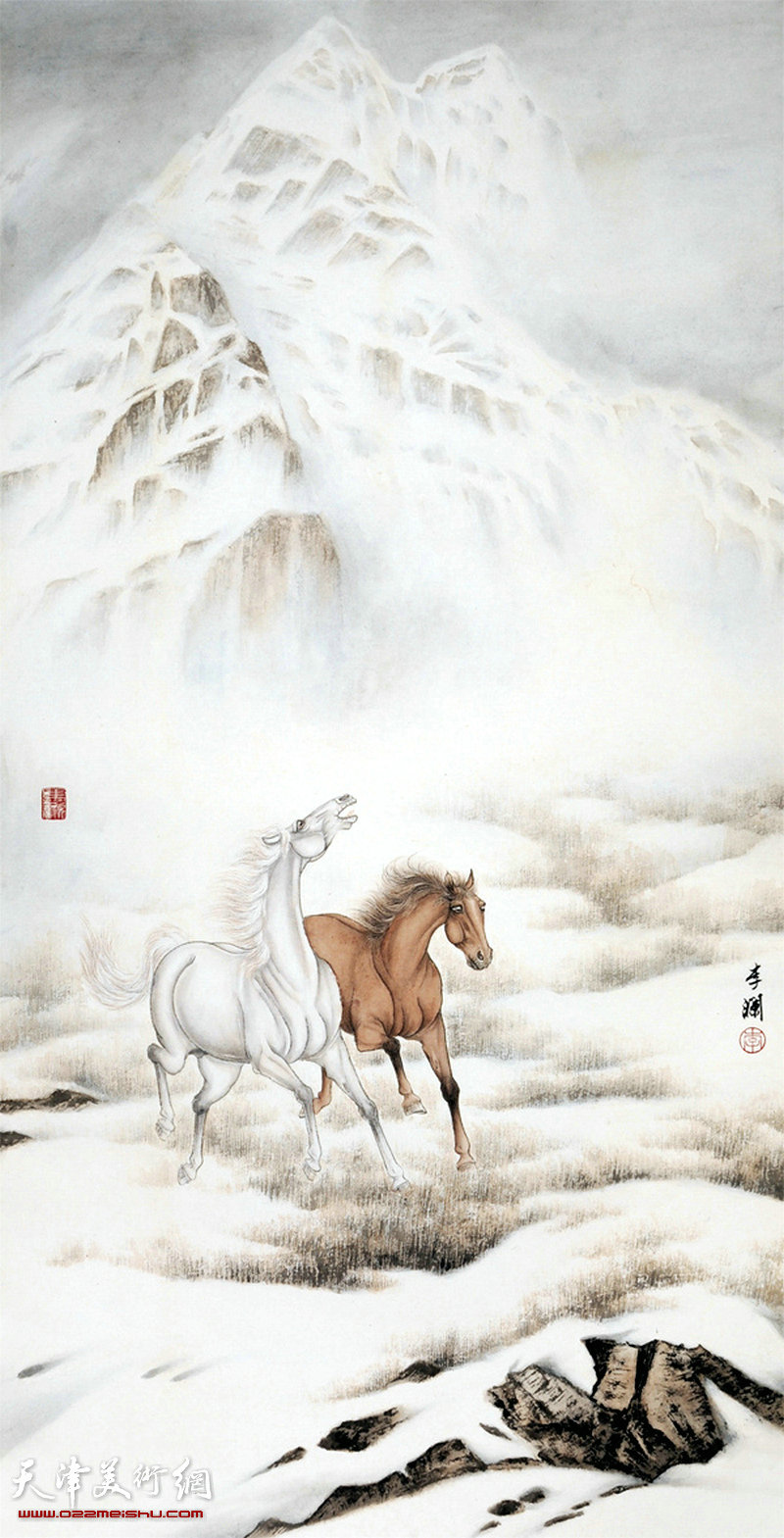 李澜雪景鞍马作品:双骏白头。