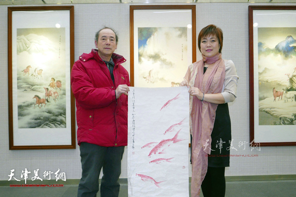 李澜与原天津市政协副主席何荣林在展览现场观看画作。